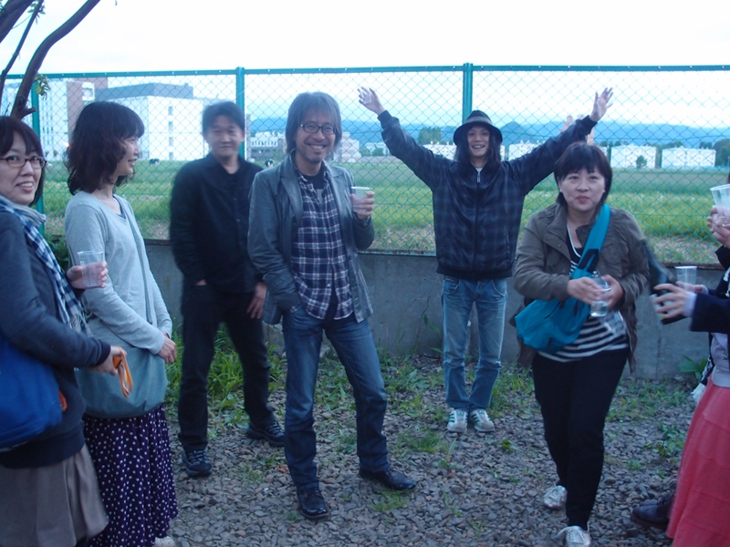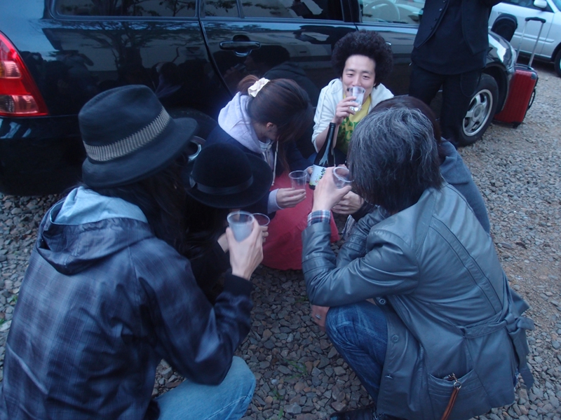 最後の打ち上げはCafetoneの庭から始まっていた。牛を見ながらみんなで地酒を一杯、車の影に隠れて二杯、小山卓治も加わって