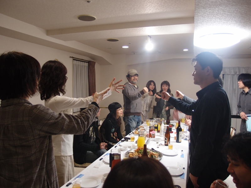 二次会は「楽天舎」近くのホテルの一室でワイワイと始まった。